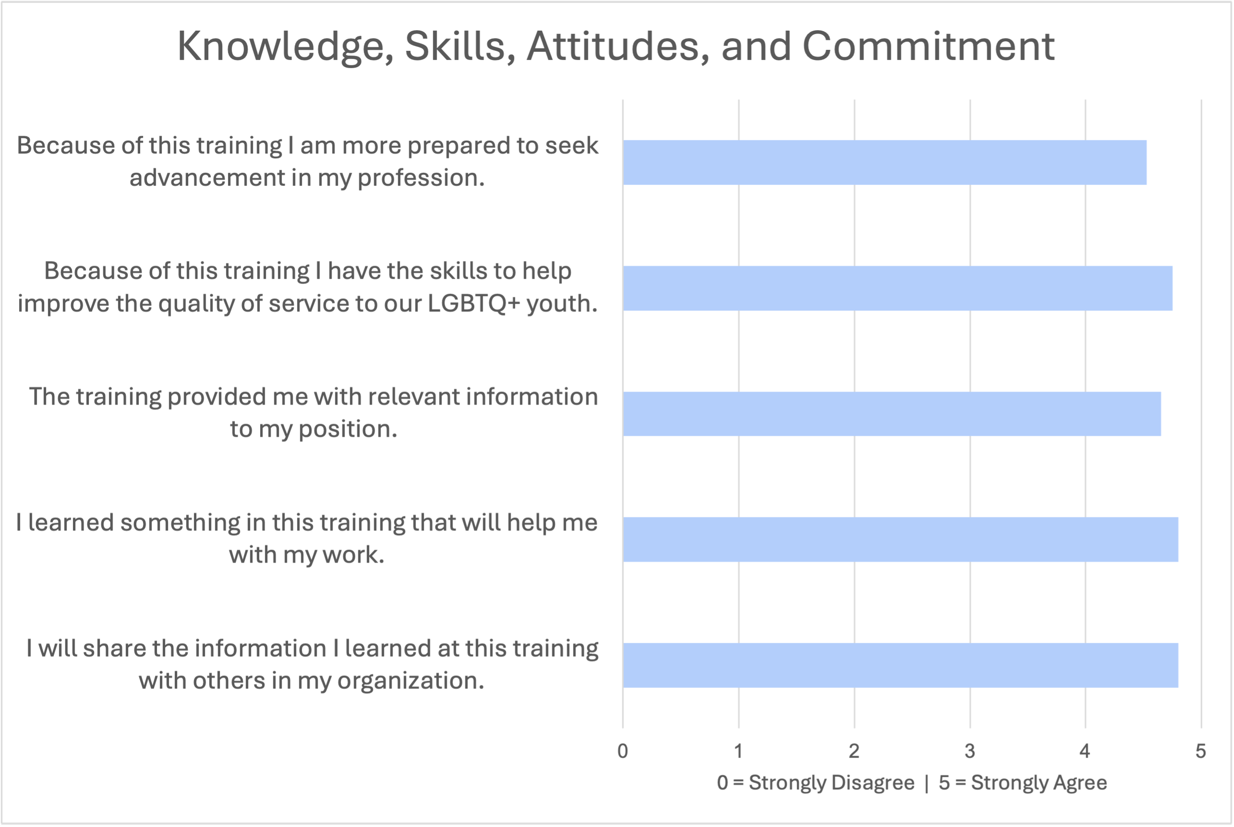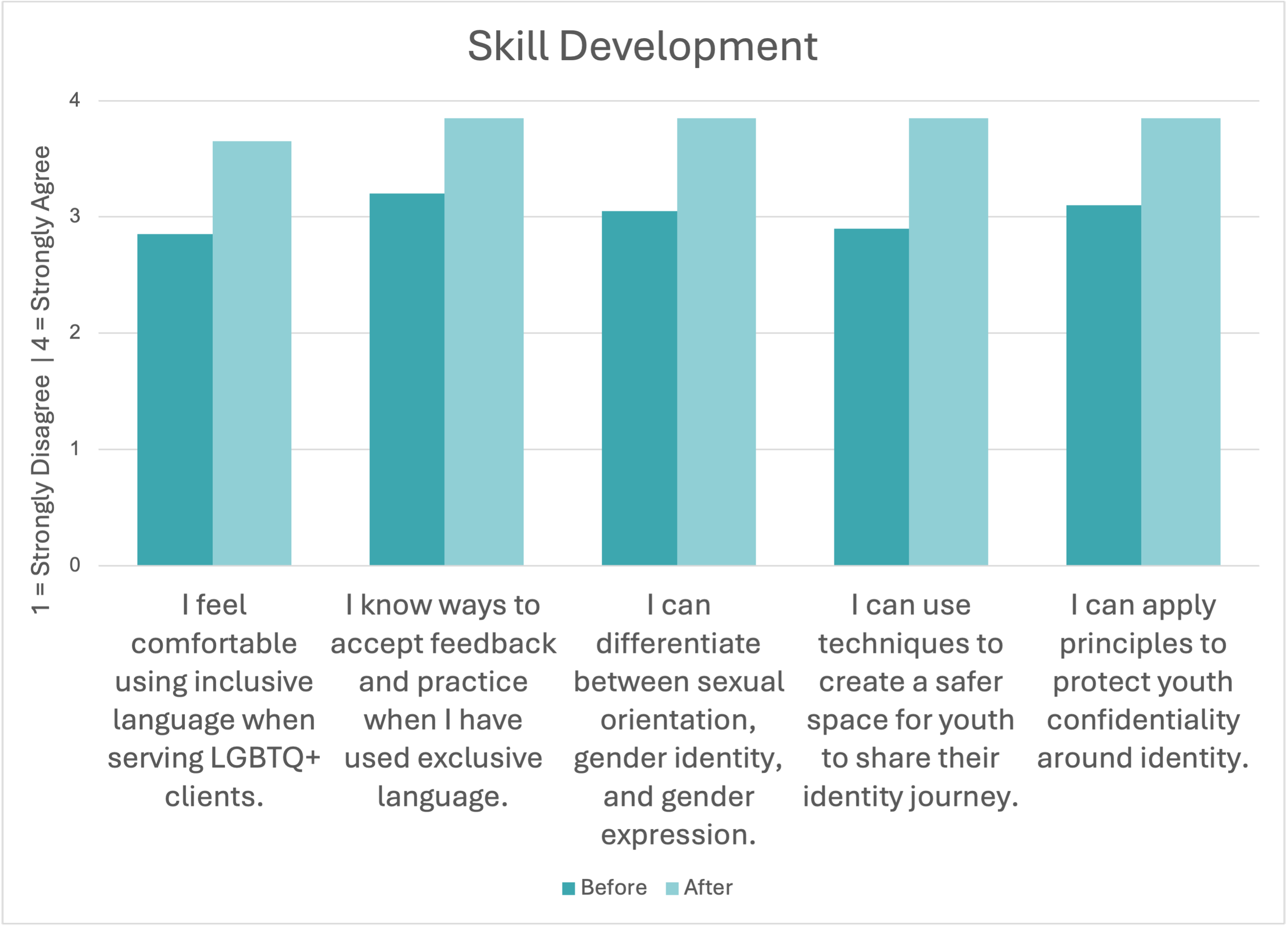 Learner competencies grew by 25% in all five target areas, and staff reported that they now have the skills to improve service quality for LGBTQ+ youth.